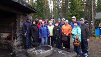 Kurssien ja kerhojen vetäjiä Urpolan laavulla nauttimassa toistensa seurasta ja tarjottavista antimista.