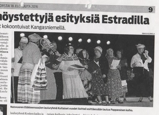 Kangasniemen lehdestä tallennettu kuva. Kultaiset vuodet esiitymismatkalla EKL Mikkelin piirin järjestämässä estraaditapahtumassa. ja vielä tänäkin päivänä v. 2022 on samoja laulajia mukana laulukerhossa.